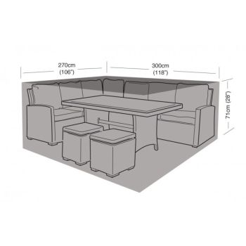 The Deluxe Large Casual Dining Set Cover offers you full protection for your garden furniture. The cover is made from strong, durable water-resistant PVC backed polyester. The material has been U.V tested for further protection and features an easy wipe surface, protecting you from all-weather types, dirt or bird droppings. It features rust-resistant brass eyelets and heavy duty security ties for secure fitting. This furniture set is suitable for a table dining set with footstools.