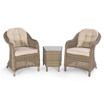 This Bistro Set is manufactured from the highest quality PU rattan woven onto a powder-coated aluminium frame, even when the sun isn't shining it can withstand the odd shower! Finished in natural and beige tones and part of the Winchester collection, relaxing outside doesn't get more stylish than this! We do, however, advise that during prolonged periods of non-use or poor weather, the cushions are stored indoors.