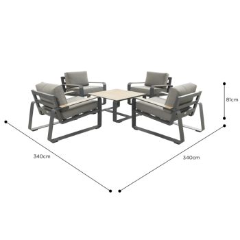 Embodying laid-back style, this Sandon set features four comfortable, relaxing lounge chairs and a sophisticated square table. Designed to seamlessly integrate into any outdoor setting, it is the perfect centrepiece for family gatherings or intimate outdoor drinks. The sumptuous relaxing chairs are the ideal space to sink into and unwind whilst the square table provides plenty of space for food and refreshments.