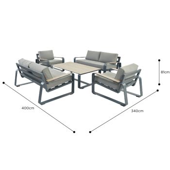 - Manufactured from a rust resistant aluminium with durable wood effect, porcelain tabletop and arm covers