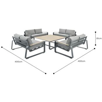 - Manufactured from a rust resistant aluminium with durable wood effect, porcelain tabletop and arm covers
