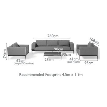 The Eve sofa has a slender, stylish design which will complement your outdoor area. The set is accompanied by a large square aluminium coffee table which caters for low-level seating. The generous three-seat sofa and two armchairs are built on strong but slender-legged powder-coated aluminium frames. A complementary square-slatted aluminium low coffee table completes the set.